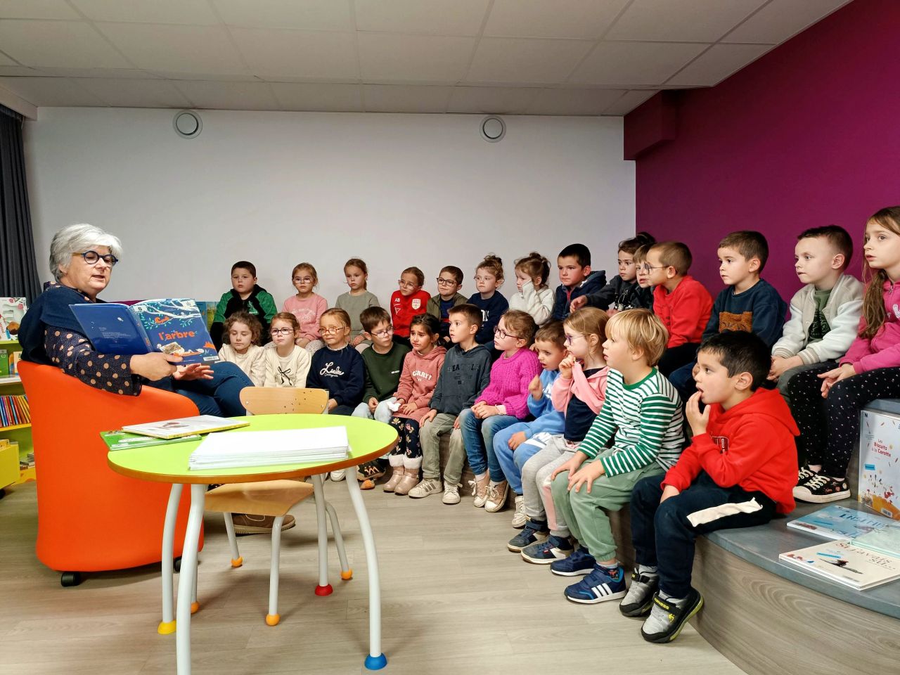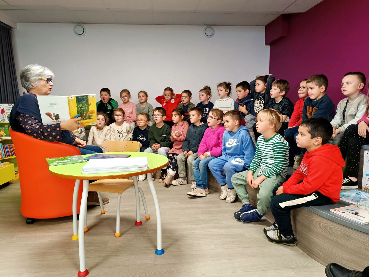 Le thème de l’année de la médiathèque est « Les arbres ». Ils ont donc écouté deux albums relatant ce thème qui correspond également au fil rouge de la classe cette année « la classe dehors ».