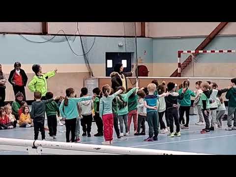 Les élèves de la classe MS/GS de Johanna et Gene, vêtus de la couleur verte, emblème de l'Océanie au sein des anneaux olympiques, ont pris la route vers la salle Owen Morvan à Lilia Plouguerneau.